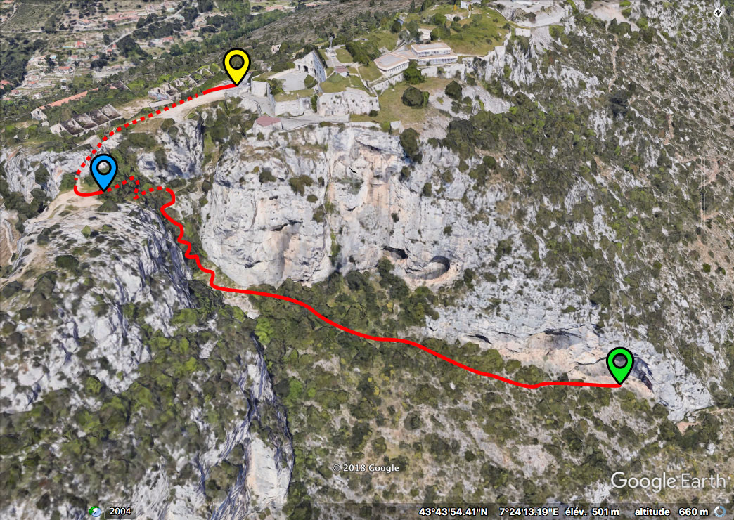 Début de sentier / descente: N 43° 43.858 E 007° 24.137